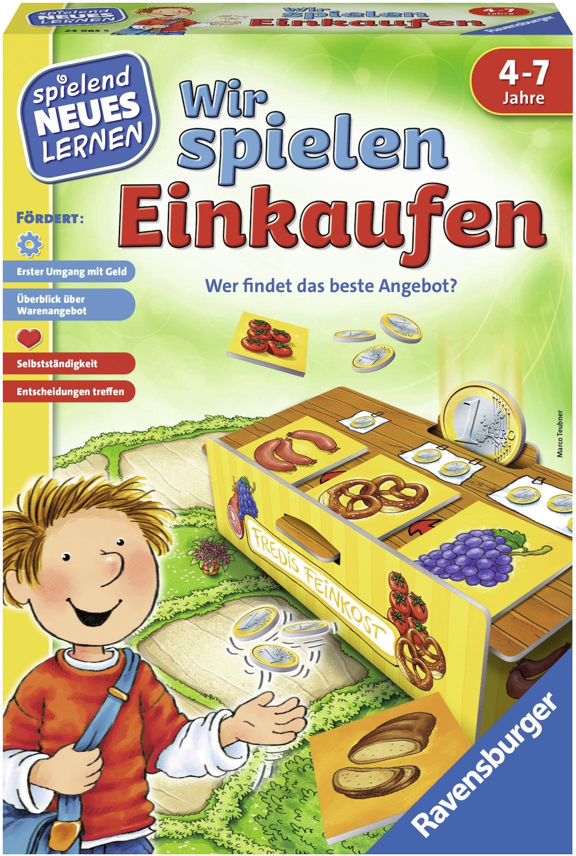 Wettlaufspiel rund um das Thema Einkaufen: das Kinderspiel »Wir spielen Einkaufen« von Ravensburger. Was kosten die Birnen? Reicht das Geld noch für Tomaten? Kinder werden auf spielerische Weise mit dem Kaufvorgang vertraut gemacht. Sie üben den Umgang mit Waren und Geld, lernen Preise zu vergleichen und gehen einen wichtigen Schritt in Richtung Selbstständigkeit.