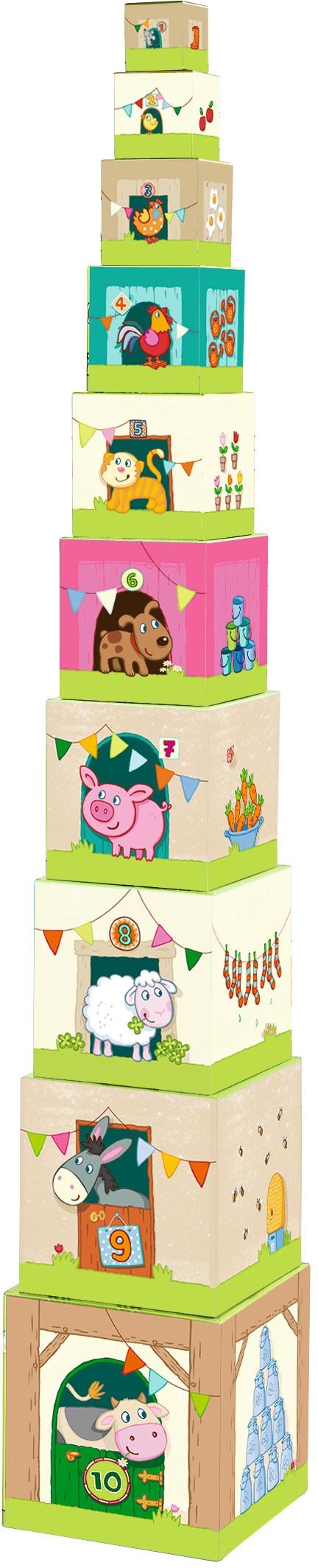 Für Bauernhof-Fans geht es mit diesem Stapelspiel hoch hinaus! Die Würfel können zu einem tollen Turm oder alle ineinander gestapelt werden. Auf den Außenseiten der Würfel gibt es für den Nachwuchs vieles zu entdecken: Bauer Tim, seinen Traktor und viele seiner Tiere. Wirft man den Turm um, kann das Stapelvergnügen gleich von vorne beginnen. Ein toller Spaß für die Kleinsten! Zudem lernen Kinder mit den Würfeln die Zahlen von 1 bis 10 kennen. 10 unterschiedlich große Würfel zum Stapeln. Altersempfehlung ab 12 Monaten.