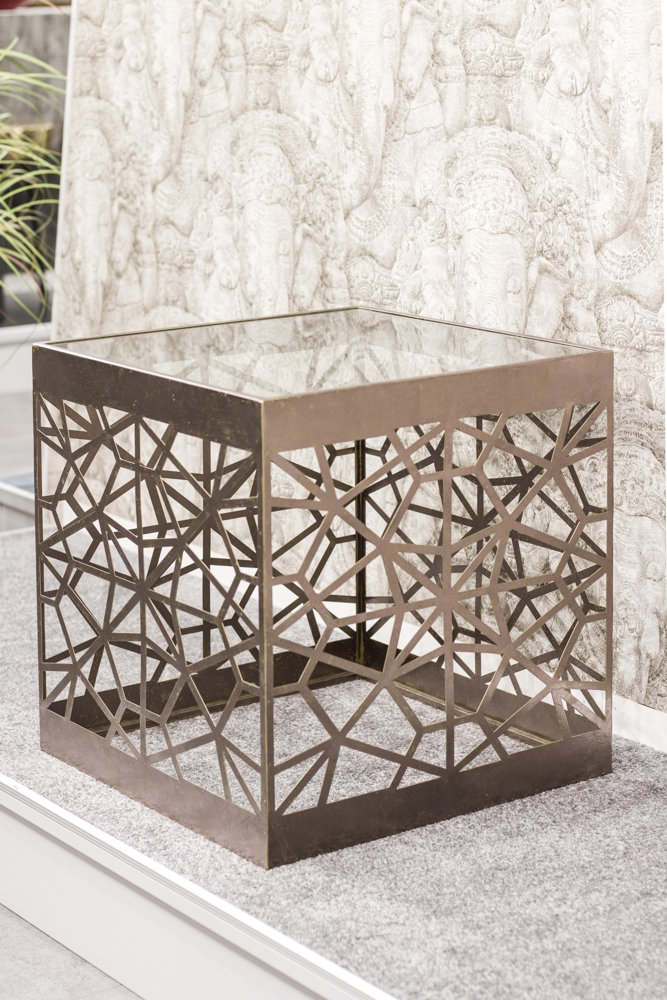 Filigranes Kleinmöbel: Der Beistelltisch von HAKU in Würfelform besitzt ein Gestell aus Metall mit geometrischen Stanzungen. Den Antik-Look verdankt der Tisch seiner Lackierung. Hierzu bildet die Tischplatte aus Glas einen eleganten Kontrast. Neben der Optik punktet das Möbelstück durch seine vielseitigen Einsatzmöglichkeiten: Im Wohnzimmer eignet sich der Tisch, um ihn neben dem Sofa oder dem Sessel als Ablage für Getränke oder Zeitschriften zu nutzen. Alternativ hierzu kann er im Schlafzimmer als Nachttisch eingesetzt werden. Bei dem verwendeten Glas handelt es sich um Sicherheitsklarglas, das sich durch eine erhöhte Stabilität auszeichnet. Aufgrund seines Designs lässt sich der Beistelltisch von HAKU in Würfelform mit unterschiedlichen Einrichtungsstilen kombinieren.