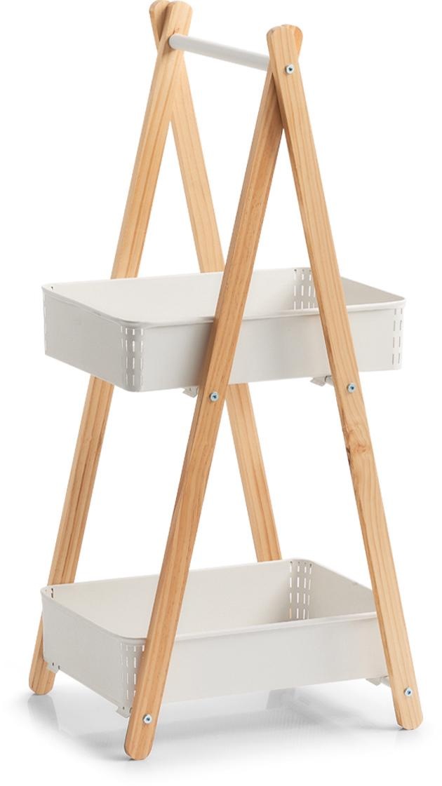 Sie sind auf der Suche nach einem modernen, trendigen Standregal? Auf unser Regal, das in weißem Metall und Holz daherkommt, treffen diese Eigenschaften definitiv zu. Ob im Badezimmer zur Aufbewahrung Ihrer Kosmetika oder Handtücher, in der Küche zur Lagerung von Lebensmitteln oder im Büro als Ordnungshalter Ihrer Unterlagen - das Regal ist variabel einsetzbar und fügt sich perfekt in den Raum ein. Dank der beiden schräg stellbaren Körbe mit Meshböden kann der Inhalt jederzeit leicht entnommen werden. Sollte das Regal einmal nicht benötigt werden, lässt es sich platzsparend zusammenklappen und so in kleinen Nischen aufbewahren.