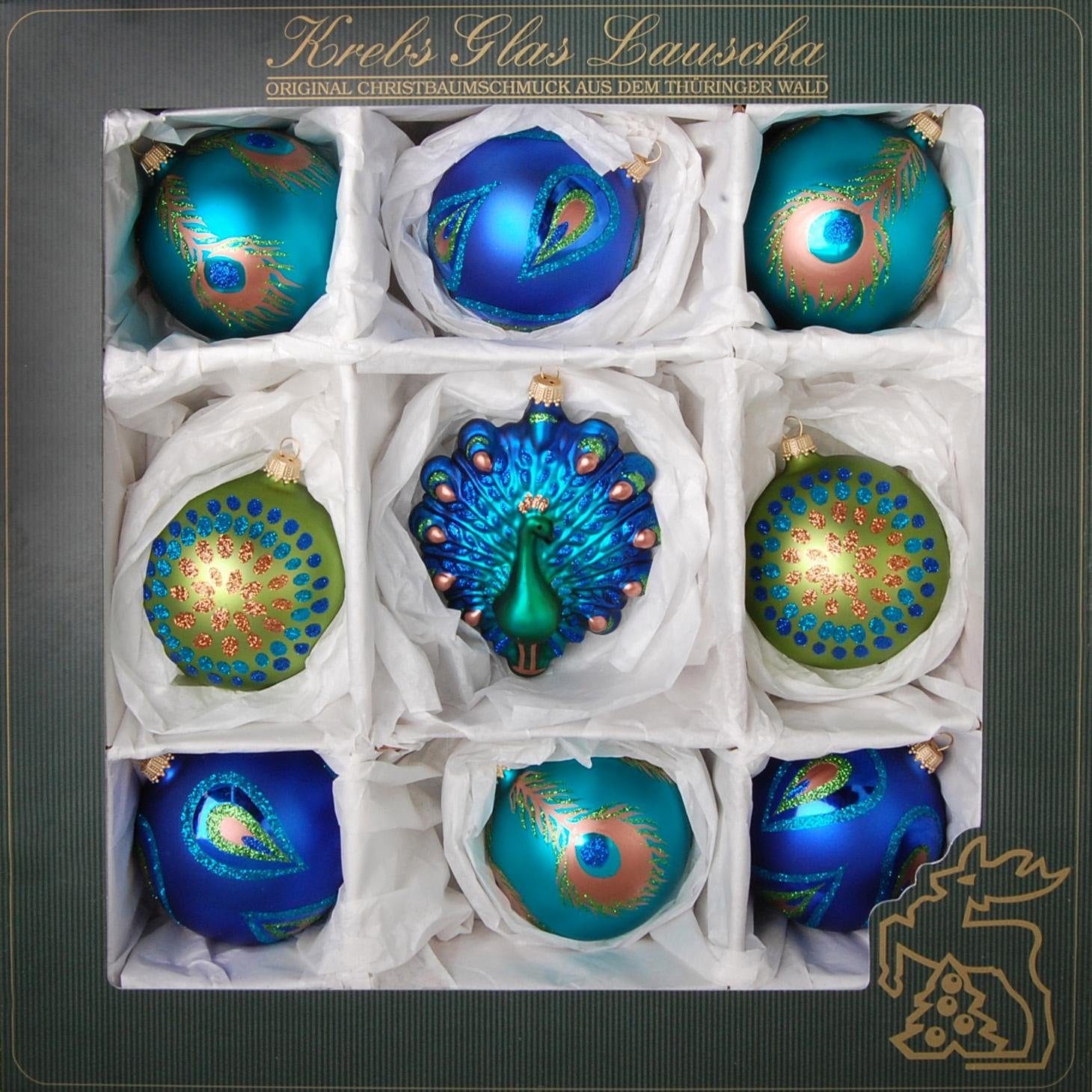 Für einen bunten Blickfang sorgt dieser Christbaumschmuck von Krebs Glas Lauscha. Das 9-teilige Set besteht zum Großteil aus Glaskugeln mit einem Durchmesser von ca. 8 cm. Die mundgeblasenen Kugeln wurden allesamt mit der Hand bemalt. Passend zu der Pfauen-Figur sind darauf Pfauenfedern abgebildet. Der Blaue Pfau hingegen ist ca. 11 cm hoch und bildet den Mittelpunkt des Sets. Der prächtige Vogel sorgt für einen unverwechselbaren Blickfang am Christbaum. Geliefert wird der Christbaumschmuck von Krebs Glas Lauscha in einer exklusiven Box, die auch zur Aufbewahrung verwendet werden kann. Das Set besteht aus 8x Ø 8 cm matt gemustert, 1x Pfau Höhe: 11 cm.