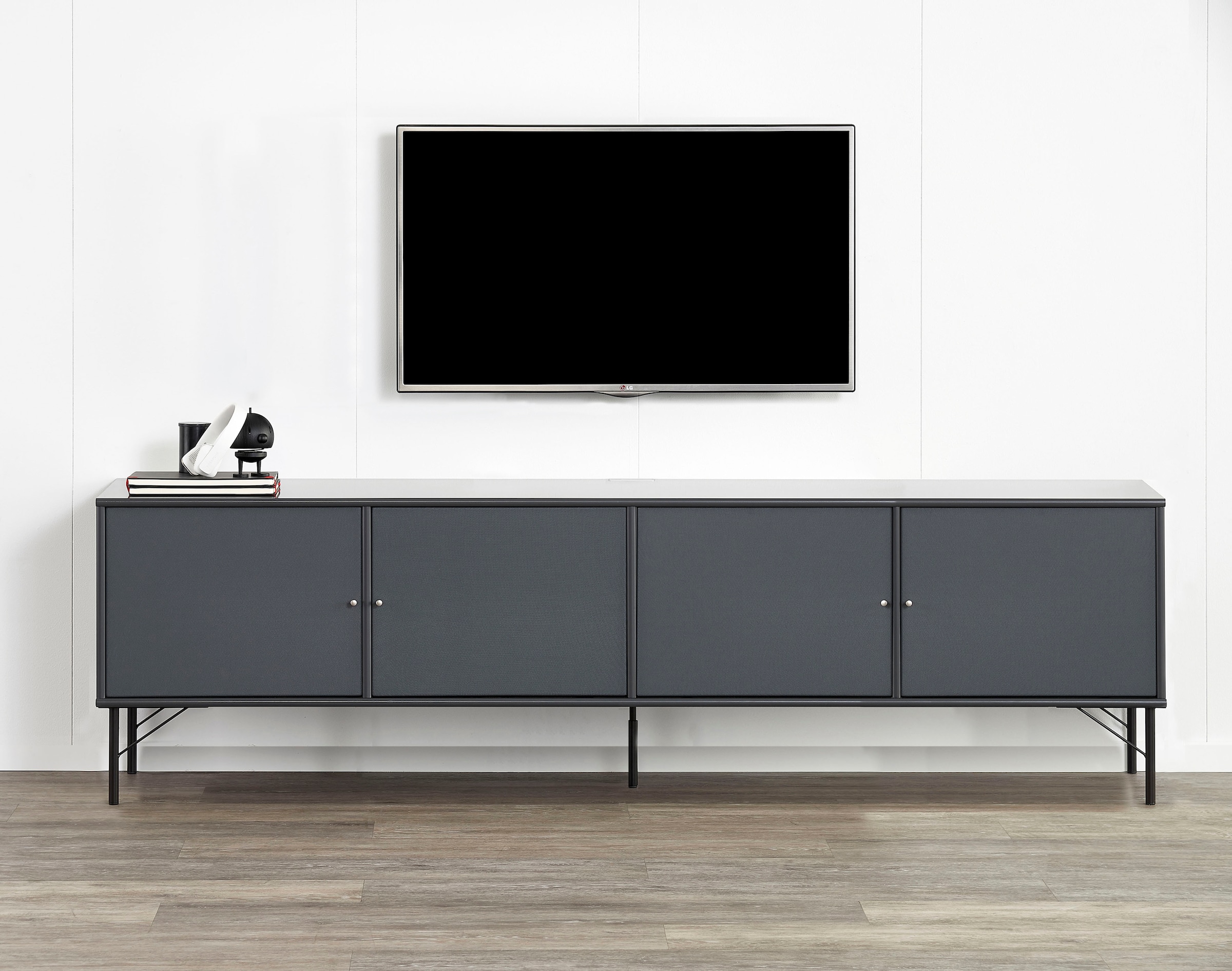 - Elegantes Media-Board von <b>Mistral</b> mit vierTüren mit Akustikstoff und Metall Füße