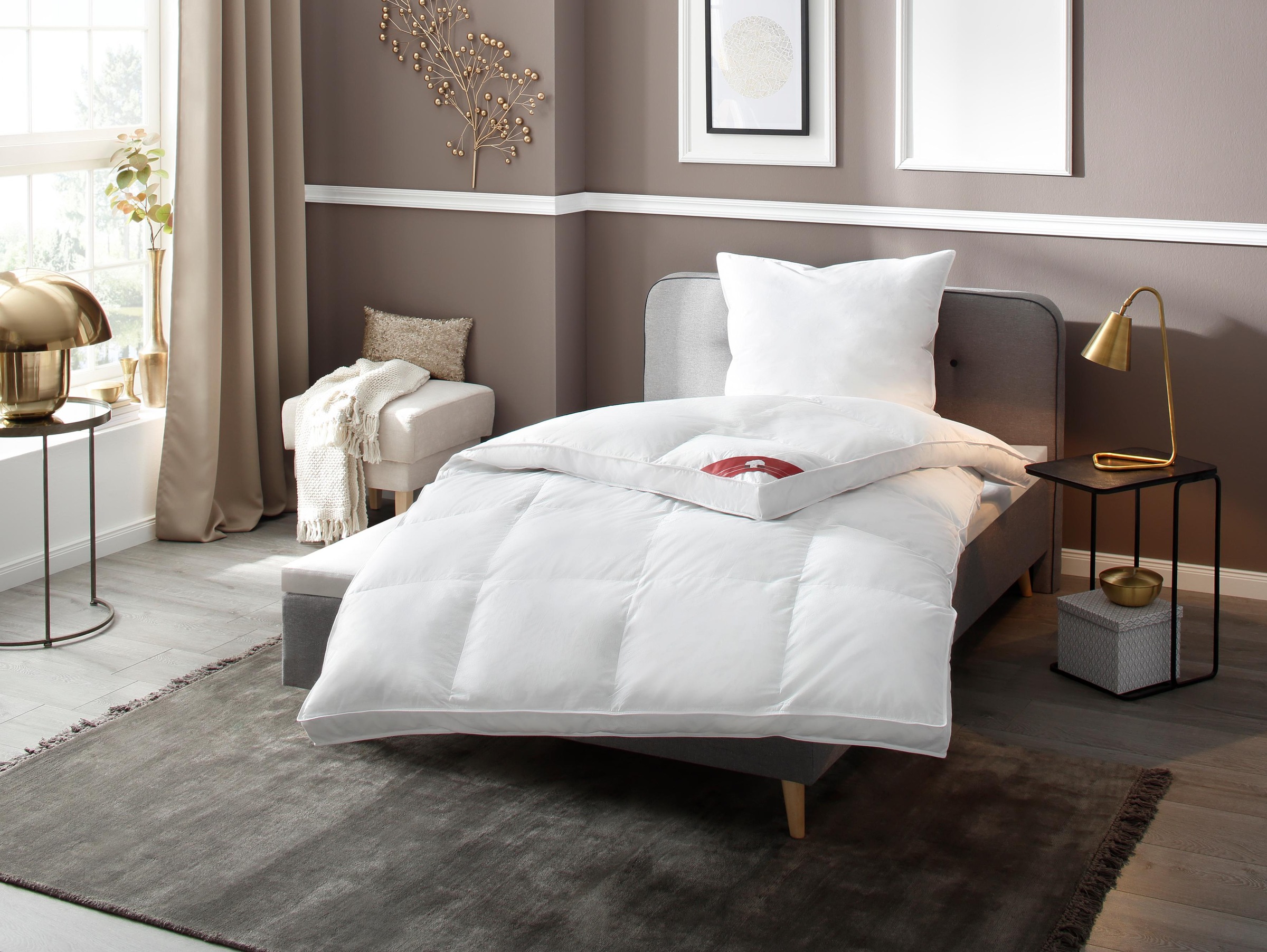 Materialzusammensetzung | Bezug: 100% Baumwolle. Füllung: 50% Daunen, 50% Federn |