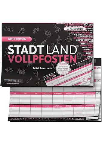 - Spiel »Stadt Land Vollpfosten, Girls Edition Mädchenrunde A4 Block« Made in GermanyDenkriesenUrsprünglicher PreisUVP 12,99 €Rabatt- 10 %Aktueller Preis11,60 €