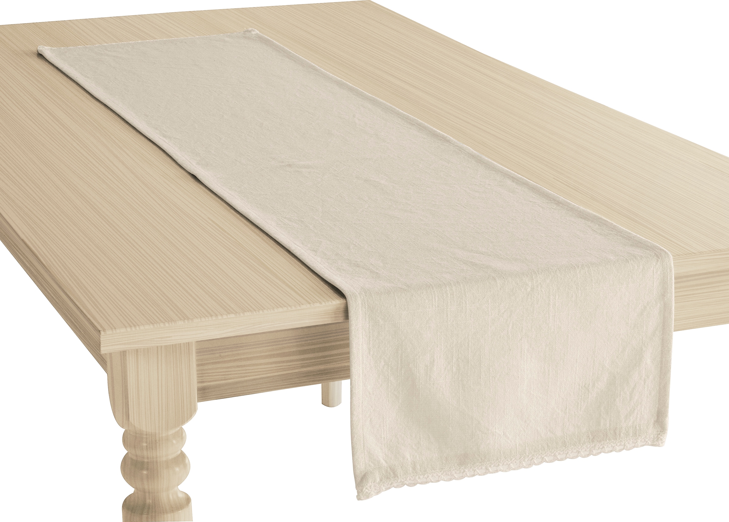 - Tischläufer »Elyna« uni, mit schöner Spitze, weiche Haptik, leicht strukturiert, 150x35cmOTTO homeUrsprünglicher PreisUVP 13,99 €Rabatt- 58 %Aktueller Preis5,79 €Neu