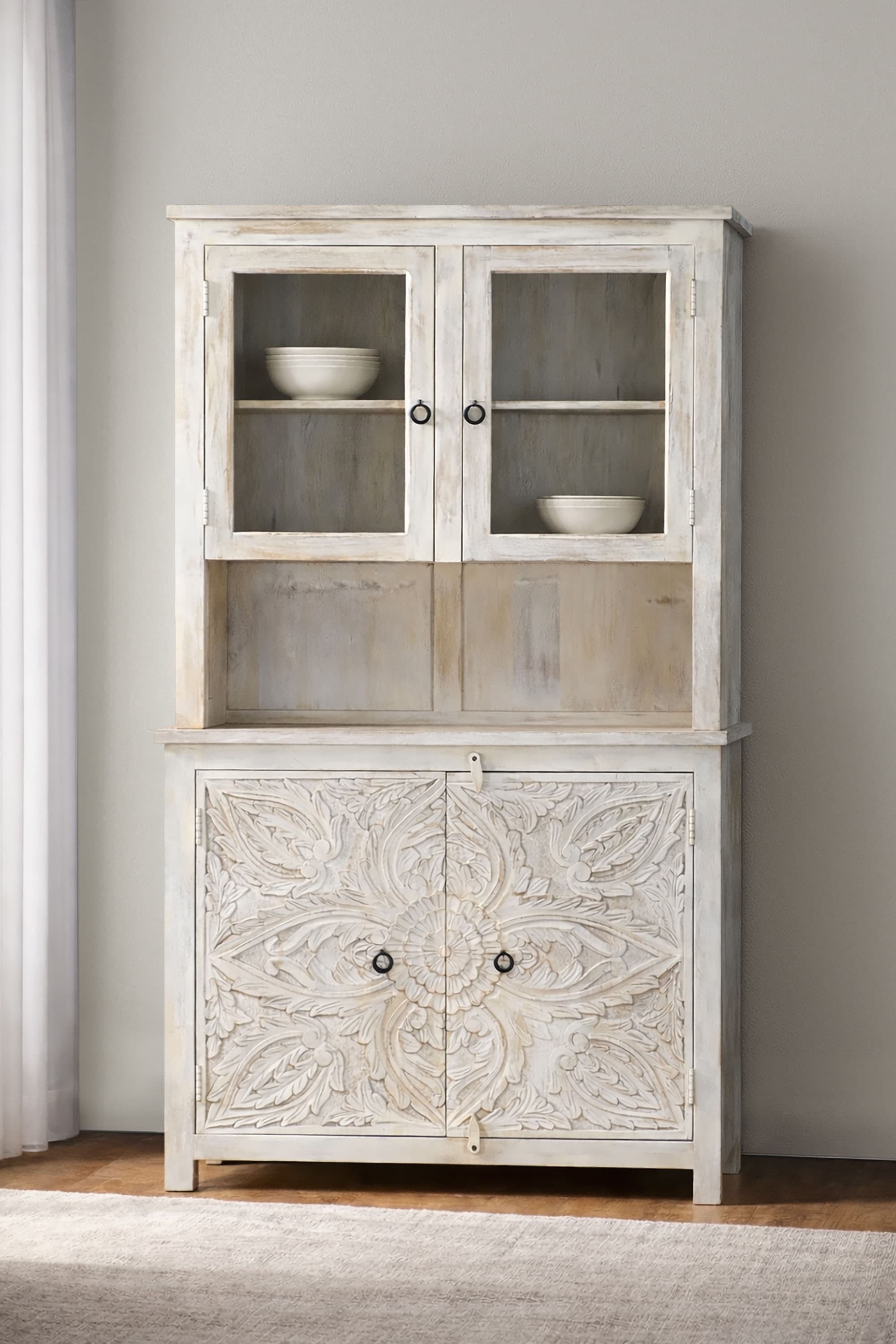 Hinter den Schranktüren im unteren Bereich verschwinden alltägliches Geschirr und schwere Küchengeräte. Im oberen Vitrinenteil präsentieren Sie stilsicher hochwertige und dekorative Gegenstände: das feine Keramikset aus dem letzten Urlaub am Mittelmeer, die von Oma geerbten Mokkatassen aus Porzellan oder Ihre Sammlung nostalgischer Blechdosen.